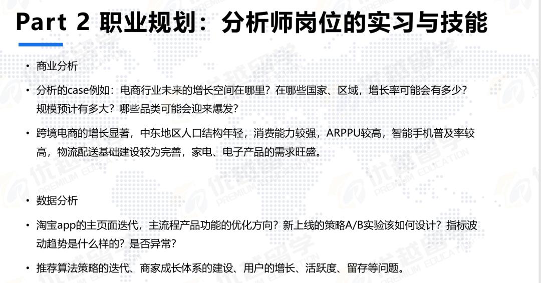所以大家可以看到,商業(yè)分析和數(shù)據(jù)分析這兩類不同崗位,在準(zhǔn)備的時(shí)候需要找對應(yīng)的實(shí)習(xí)。比如學(xué)經(jīng)濟(jì)學(xué)的同學(xué)未來想去做商業(yè)分析師,就應(yīng)該找一些分析行業(yè)案例的商業(yè)分析崗位實(shí)習(xí);如果想做數(shù)據(jù)分析師,就重點(diǎn)關(guān)注那些能參與公司產(chǎn)品策略復(fù)盤、決策甚至指標(biāo)分析的實(shí)習(xí)機(jī)會(huì),這樣的實(shí)習(xí)對未來申請目標(biāo)崗位會(huì)有很大幫助。