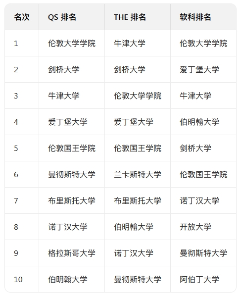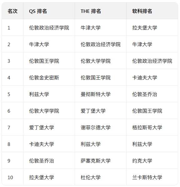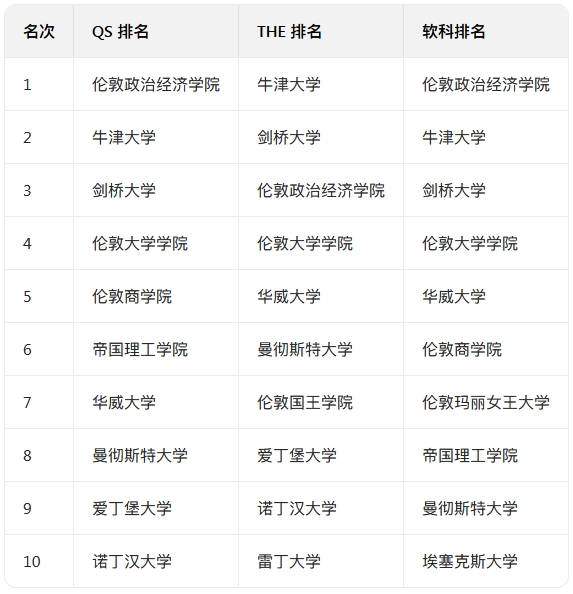 三大排名通殺院校:牛津大學、劍橋大學、倫敦大學學院、倫敦政治經濟學院、華威大學、曼徹斯特大學。
