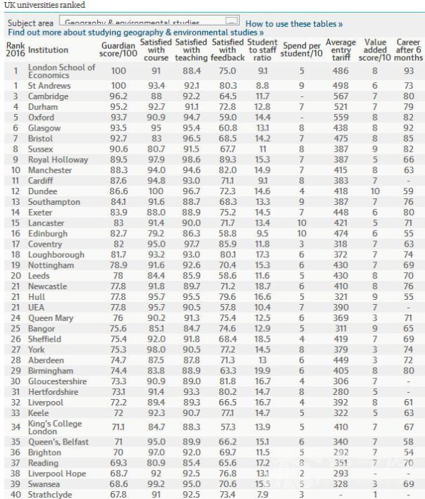 近期,英國(guó)《衛(wèi)報(bào)》發(fā)布了英國(guó)大學(xué)綜合排名,同時(shí)也發(fā)布了2016《衛(wèi)報(bào)》英國(guó)大學(xué)專業(yè)排名,根據(jù)最新的2016《衛(wèi)報(bào)》英國(guó)大學(xué)藝術(shù)專業(yè)排名可以看出,此次排名位于首位的是倫敦大學(xué)學(xué)院,第二名牛津大學(xué),第三名為紐卡斯特爾大學(xué),第四名為愛(ài)丁堡大學(xué),具體如下: