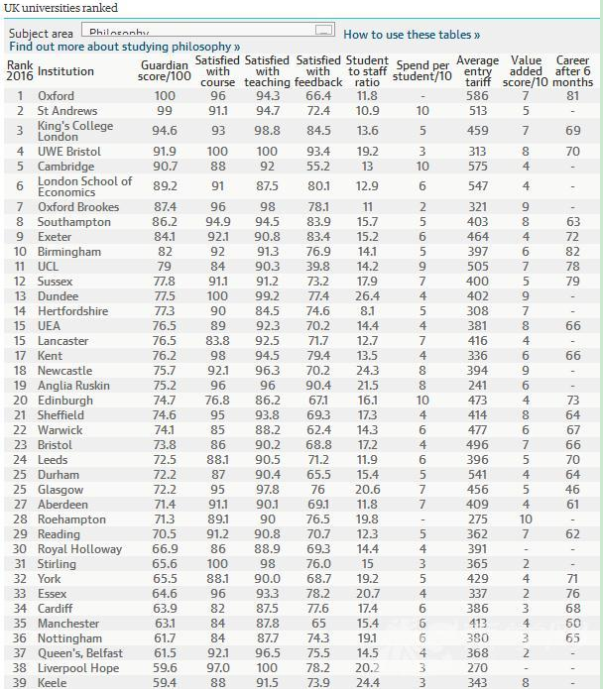 英國《衛(wèi)報》發(fā)布了英國大學(xué)綜合排名,同時也發(fā)布了2016《衛(wèi)報》英國大學(xué)專業(yè)排名,根據(jù)最新的2016《衛(wèi)報》英國大學(xué)哲學(xué)專業(yè)排名可以看出,此次排名位于首位的是牛津大學(xué),第二名為圣安德魯斯大學(xué),第三名為倫敦國王學(xué)院,具體如下: