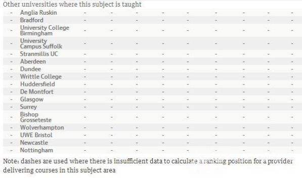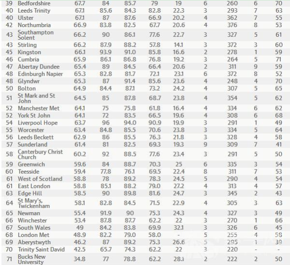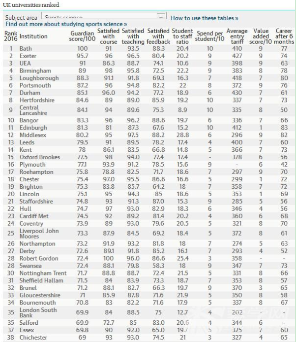 英國《衛(wèi)報(bào)》發(fā)布了英國大學(xué)綜合排名,同時也發(fā)布了2016《衛(wèi)報(bào)》英國大學(xué)專業(yè)排名,根據(jù)最新的2016《衛(wèi)報(bào)》英國大學(xué)運(yùn)動科學(xué)專業(yè)排名可以看出,此次排名位于首位的是巴斯大學(xué),第二名為??巳卮髮W(xué),具體如下: