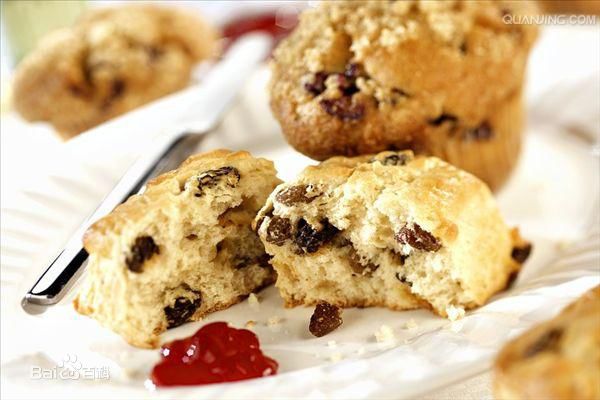 司康算是很能代表英國(guó)的一種甜點(diǎn)了吧?它還可以叫英國(guó)松餅、英國(guó)薄餅。司康雖然長(zhǎng)得其貌不揚(yáng),很像一塊普通的小餅,但是味道還是相當(dāng)好的?。∷究悼墒怯⑹较挛绮枥锉夭豢缮俚囊环N東西,女王也每天都要吃的呢!