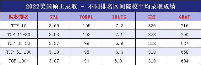 從錄取數(shù)據(jù)來看,高GPA、托福和GRE成績(jī)的學(xué)生在申請(qǐng)中依舊占據(jù)明顯優(yōu)勢(shì)。以下是2022年美國(guó)不同排名區(qū)間院校在碩士研究生錄取時(shí),對(duì)學(xué)生各項(xiàng)成績(jī)的平均要求: