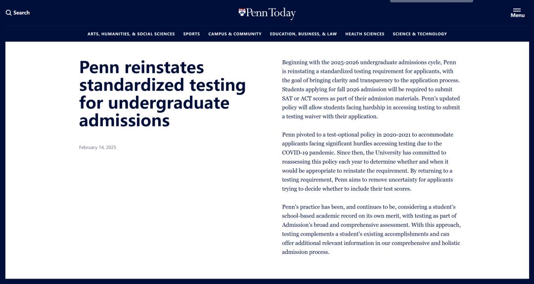 最近,美國(guó)各大學(xué)的 ED2 錄取結(jié)果陸續(xù)公布,就在這個(gè)時(shí)候,賓夕法尼亞大學(xué)放出了一個(gè)重磅消息。2 月 14 日,賓大通過(guò)《賓大日?qǐng)?bào)》發(fā)布通知:從 2025 - 2026 年本科招生周期開(kāi)始,也就是 2026 年秋季入學(xué)的申請(qǐng)季(2026Fall),賓大將恢復(fù)對(duì)美國(guó)本科留學(xué)申請(qǐng)者的標(biāo)準(zhǔn)化考試要求。