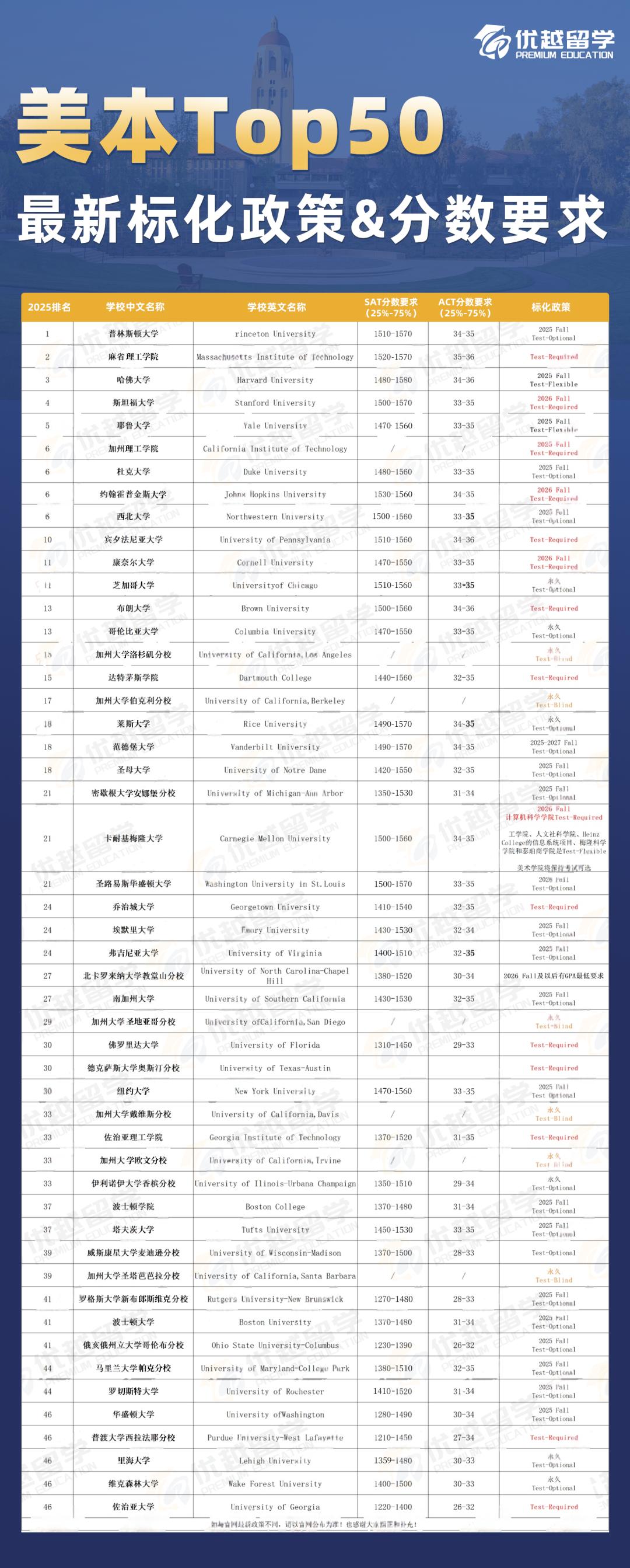 就目前來(lái)看,8所藤校中,除了哥倫比亞大學(xué)是永久可選,普林斯頓大學(xué)暫未更新26Fall招生政策,其他6所藤校都已經(jīng)要求申請(qǐng)人提交標(biāo)化成績(jī)。而且,不同學(xué)校的標(biāo)化政策和分?jǐn)?shù)要求差異不小。優(yōu)越君給大家整理了美國(guó)top50院校已經(jīng)錄取公布了其最新標(biāo)化政策及分?jǐn)?shù)要求,詳情可見(jiàn)??