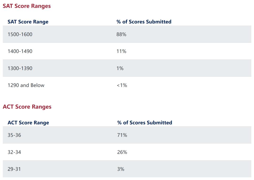 其中,ACT 成績(jī)的中段分?jǐn)?shù)區(qū)間在 34 - 36 分,這意味著一半提交成績(jī)的學(xué)生,分?jǐn)?shù)都在這個(gè)范圍之內(nèi);SAT 中段成績(jī)則在 1510 - 1560 分。