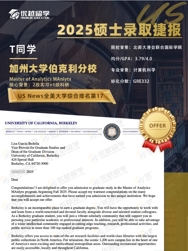 以上是【【美國碩士】中外合作計算機背景,錄取加州大學伯克利分校分析學碩士】相關(guān)的全部內(nèi)容,查看更多【美國碩士錄取】相關(guān)資訊可前往【優(yōu)越留學】首頁!詳細申請規(guī)劃及方案定制請預約優(yōu)越留學顧問為你一對一解答!