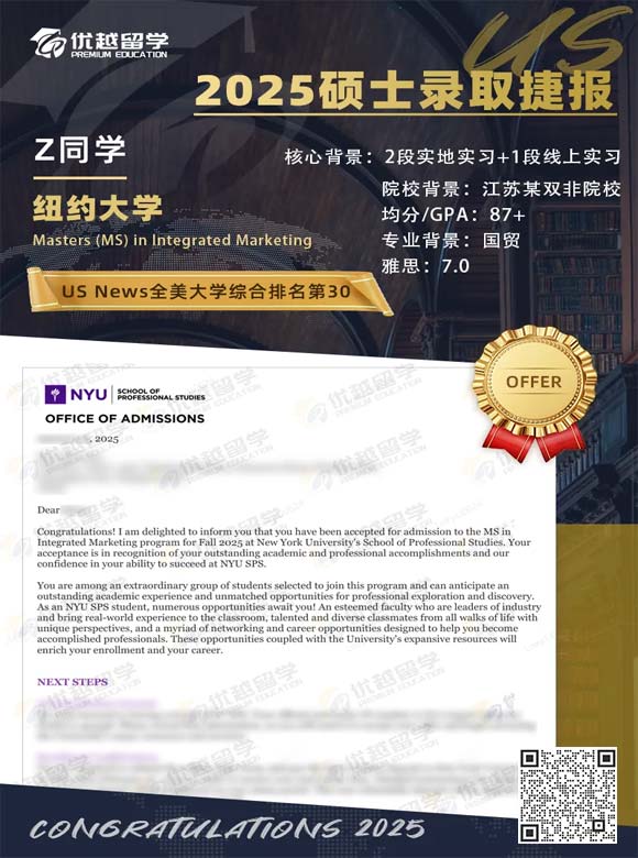 以上是【【美國碩士】offer+1:雙非國貿生錄取紐約大學整合營銷專業(yè)】相關的全部內容,查看更多【美國碩士留學】相關資訊可前往【優(yōu)越留學】首頁!詳細申請規(guī)劃及方案定制請預約優(yōu)越留學顧問為你一對一解答!